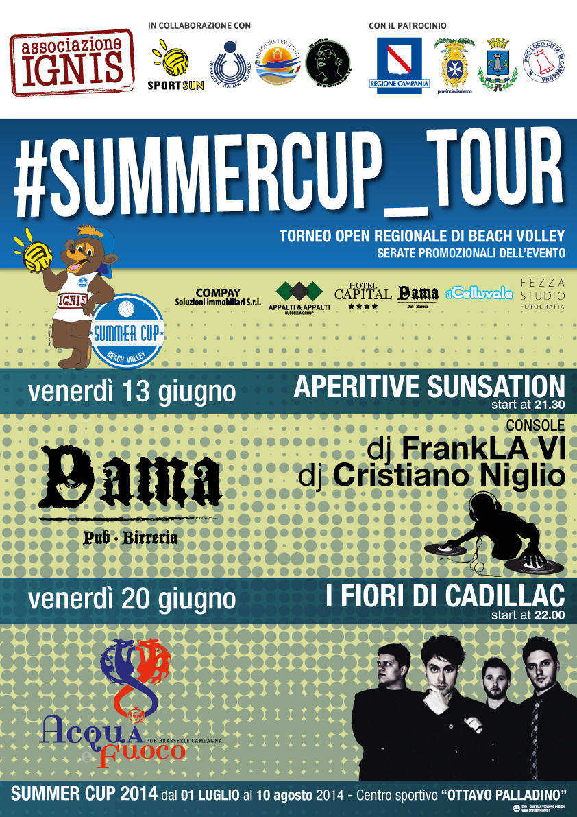 CI SIAMO! da questa settimana prendono vita ufficialmente le attività della SUMMER CUP 2014…si parte con il #SUMMERCUP_TOUR con la prima serata promozionale dell’evento il 13 giugno 2014 al Dama pub in loc.Quadrivio di Campagna ore 21.30 con i dj set da parte dei dj Cristiano Niglio e FrankLA VI e la seconda serata il giorno 20.06.2014 al pub brasserie Acqua e Fuoco di Campagna centro storico con i “I fiori di Cadillac” vi aspettiamo numerosi per presentare a tutti voi la SUMMER CUP 2014 e le sue molteplici novita! SUMMER CUP 2014 COMING SOON!
