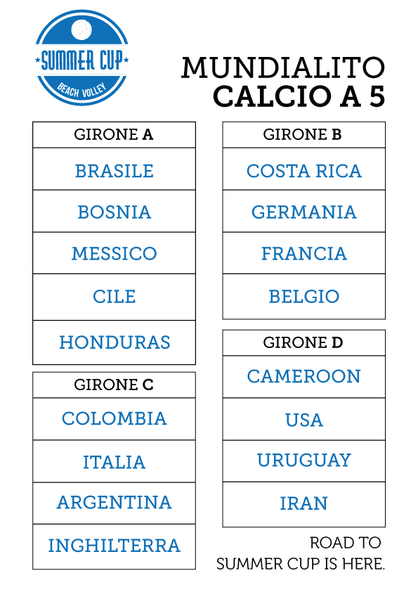 Stamani alle 11.00 verranno pubblicati i gironi e il calendario del nostro primo torneo, il “Mundialito di calcio a 5” restate connessi con noi e con la nostra Fan Page Summer Cup, da dove accingerete a tutte le news e tutte le comunicazioni da parte dell’Organizzazione.